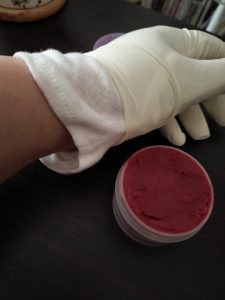赤い色が付くので、塗った後には手袋をして過ごします